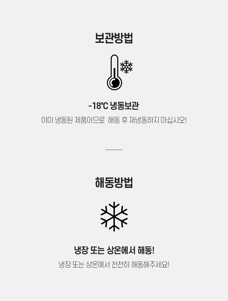 | 보관방법 또는 취급방법 | -18℃이하 냉동 보관 | ||