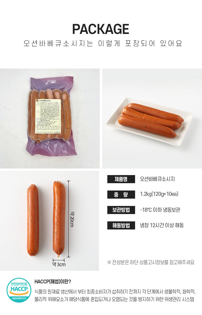 | 원재료명 및 함량 | 돼지고기 93.07%[지방일부사용, 외국산(미국, 벨기에, 스페인 등)-93.59%, 국산-6.41%], 정제수, 정제소금(국산), 옥수수전분[옥수수:외국산(러시아, 헝가리, 세르비아 등)], 설탕, 하이프로1, 생마늘, 혼합제제1(폴리인산나트륨, 메타인산나트륨,피로인산나트륨),아로맥스LA,흑후추분,백후추분,L-글루탐산나트륨제제[L-글루탐산나트륨(향미증진제),구아검산Na,이노신산Na], 소브산칼륨9보존료),비타민c,혼합제제2[옥수수분말:말토덱스트린,파프리카추출색소,D-토코페롤(혼합형)], 너트맥아롬, 혼합제제3(무수결정포도당,구연산삼나트륨,덱스트린,팽창제,코치닐추출색소),카다모클래식,코리안더클래식,아질산나트륨(발색제),콜라겐케이싱 | ||