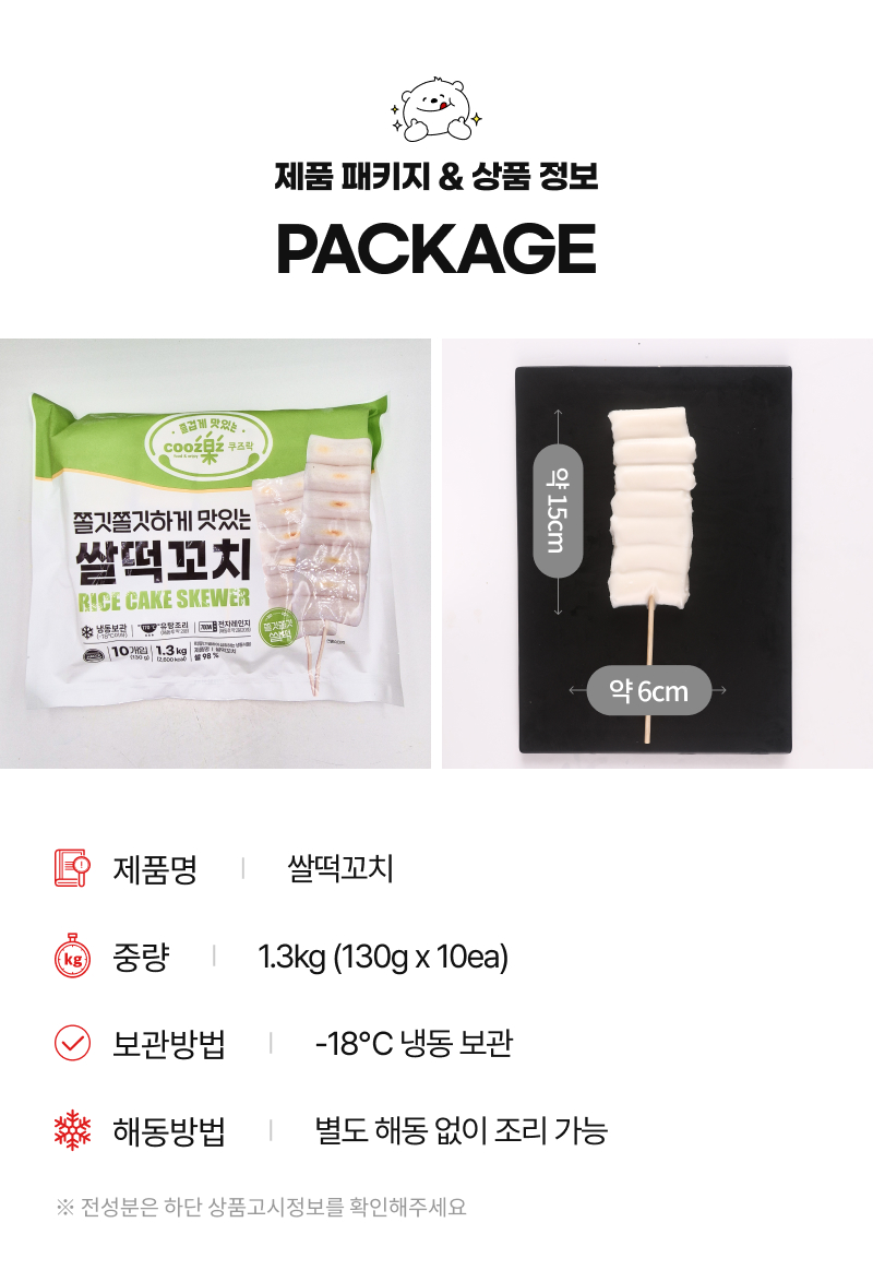 1. 이미 냉동된 바 있으니 해동 후 재냉동 시키지 마시기 바랍니다. 2. 개봉 후 남은 제품은 변질의 우려가 있으니 가급적 빨리 드시기 바랍니다. 3. 나무꼬치가 있으니 주의하여 드시기 바랍니다. 4. 조리시 튀김기름이 튀어 화상을 입을 수 있으니 주의해 주시기 바랍니다. 5. 떡의 검은 점은 쌀겨이므로 취식에 이상이 없습니다. 부정·불량식품 신고는 국번 없이 1399 |
