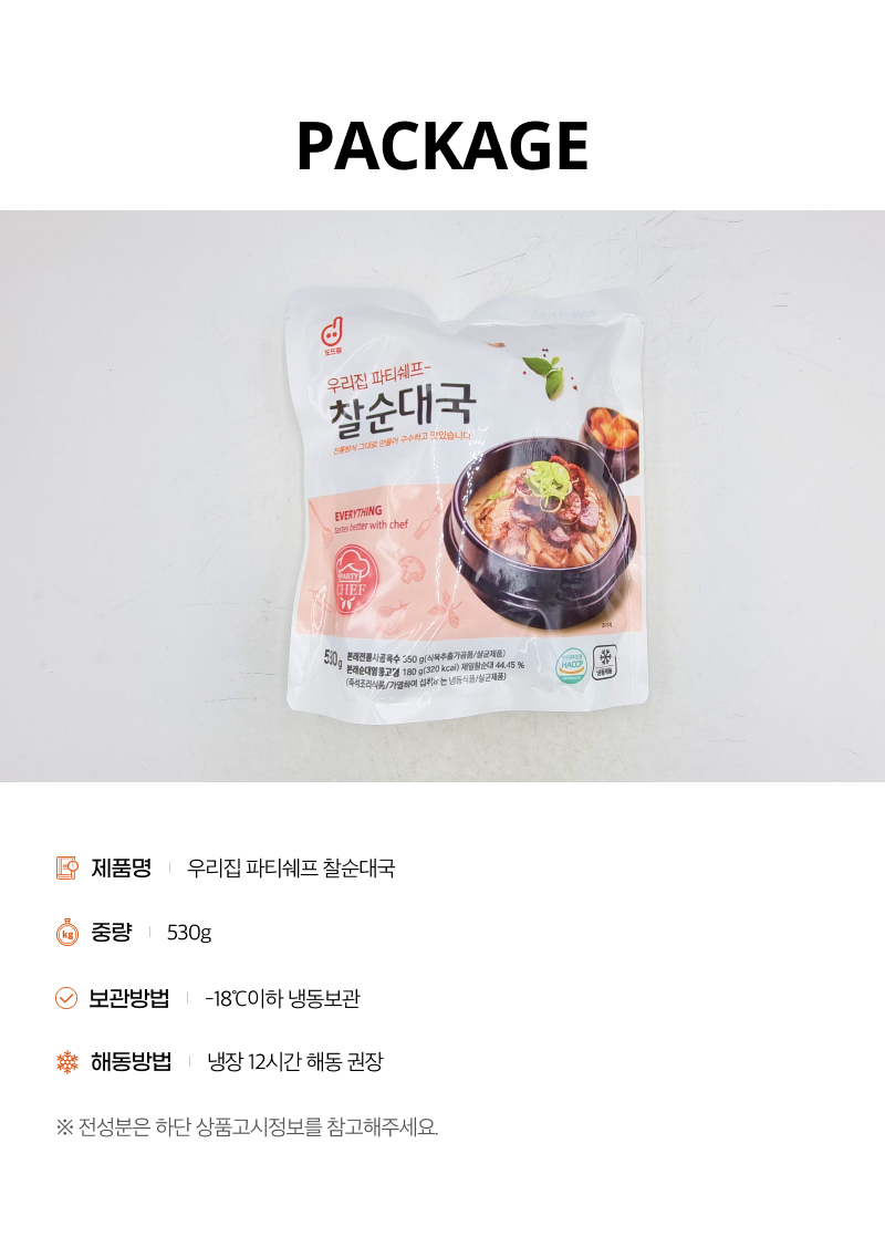 | 제품명 | 우리집 파티쉐프 찰순대국 (본래전통사골육수350g,본래순대염통고명180g) | ||