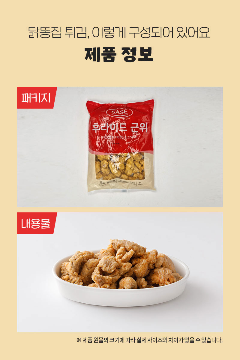 | 원재료명 및 함량 | 근위양념육[닭근위(브라질산)99.95%,정제소금(국내산)0.05%]74.07%,가라아게배터2호R{프리믹스D1{밀가루(밀:미국,호주산)}, 밀가루(밀: 미국, 호주산), 쌀가루, 정제소금], 정제수, 대두유(외국산: 미국, 아르헨티나, 중국 등), 핫마리네이션C-핫, 들깻잎, 탄산수소나트륨 | ||