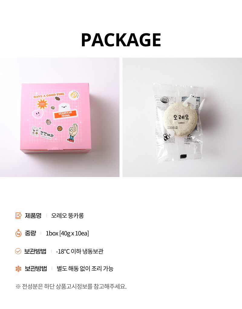 | 원재료명 및 함량 | 아몬드분말{아몬드(미국산),소맥분(밀:미국산)}, 슈가파우더(설탕,옥수수전분),슈가파우더(설탕,옥수수전분),계란흰자{난백(계란:국산),설탕,가공버터(뉴질랜드산/버터오일,유크림,야자경화유),과자1(오레오씬즈,국산),과자2{쿠키파우더(밀:미국산,호주산),팜유:말레이시아산)},중력분,정제수,가공소금 | ||