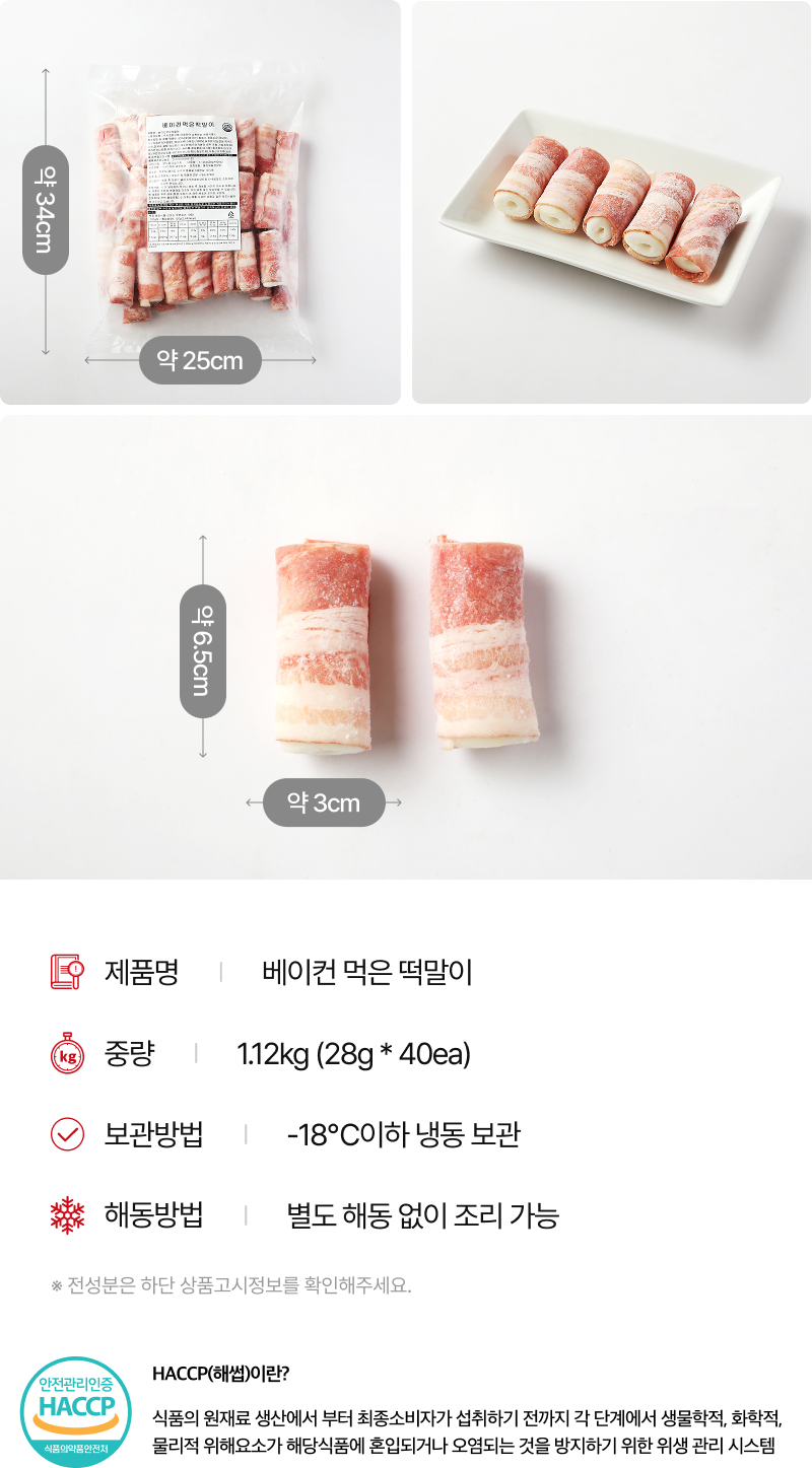| 원재료명 및 함량(원재료 함량 표시대상 식품에 한함) | 떡류61.95%[쌀(외국산),정제수,정제소금(국내산),기타식용유지가공품], 베이컨류(스페인산)38%[돼지고기(삼겹살:95%),식염,정제수,설탕,덱스트린,대두단백(유전자변경 대두 포함 가능성있음),폴리인산나트륨,카라기난,D-솔비톨,합성향료(고기향),합성향료(스모크향),구연산삼나트륨,에리토브산나트륨(산화방지제),아질산나트륨(보존료)],복합조미식품 | ||