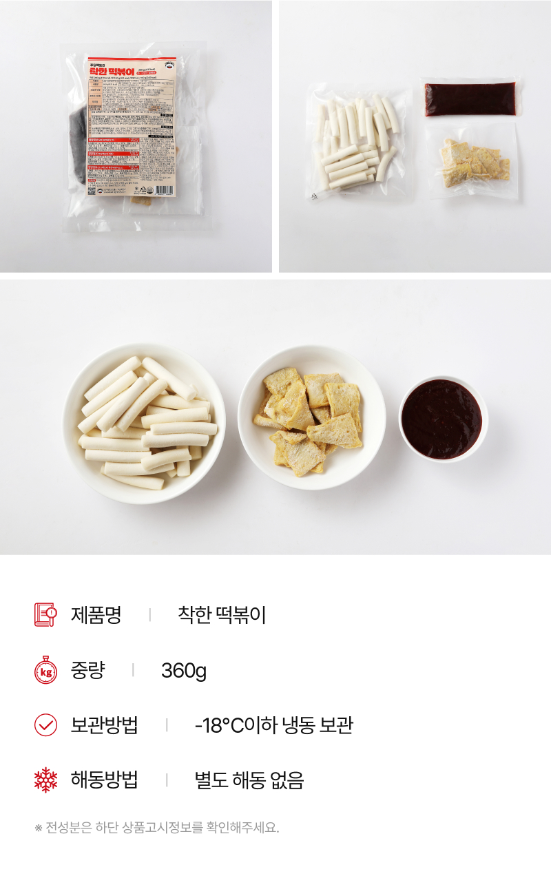 냉동 밀떡볶이 떡 : 떡류(가열하여 섭취하는 냉동식품) 푸딩팩토리 어묵 : 어묵(유탕처리제품 / 가열하여 섭취하는 냉동식품 / 비살균제품) 소스팩토리 착한떡볶이소스 : 소스(살균제품 / 가열하여 섭취하는 냉동식품) |