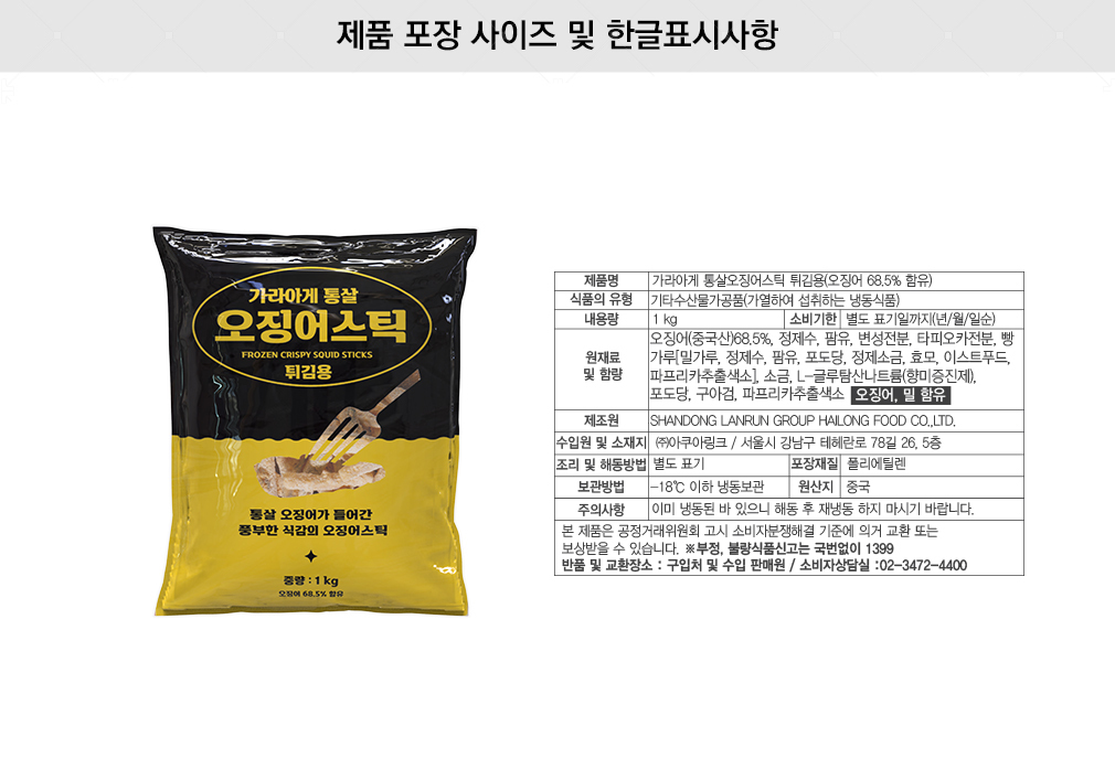 이미지 확대보기[펀쿡] 튀김용 가라아게 통살 오징어 스틱 튀김 1kg 오징어몸채 대용량 업소용
