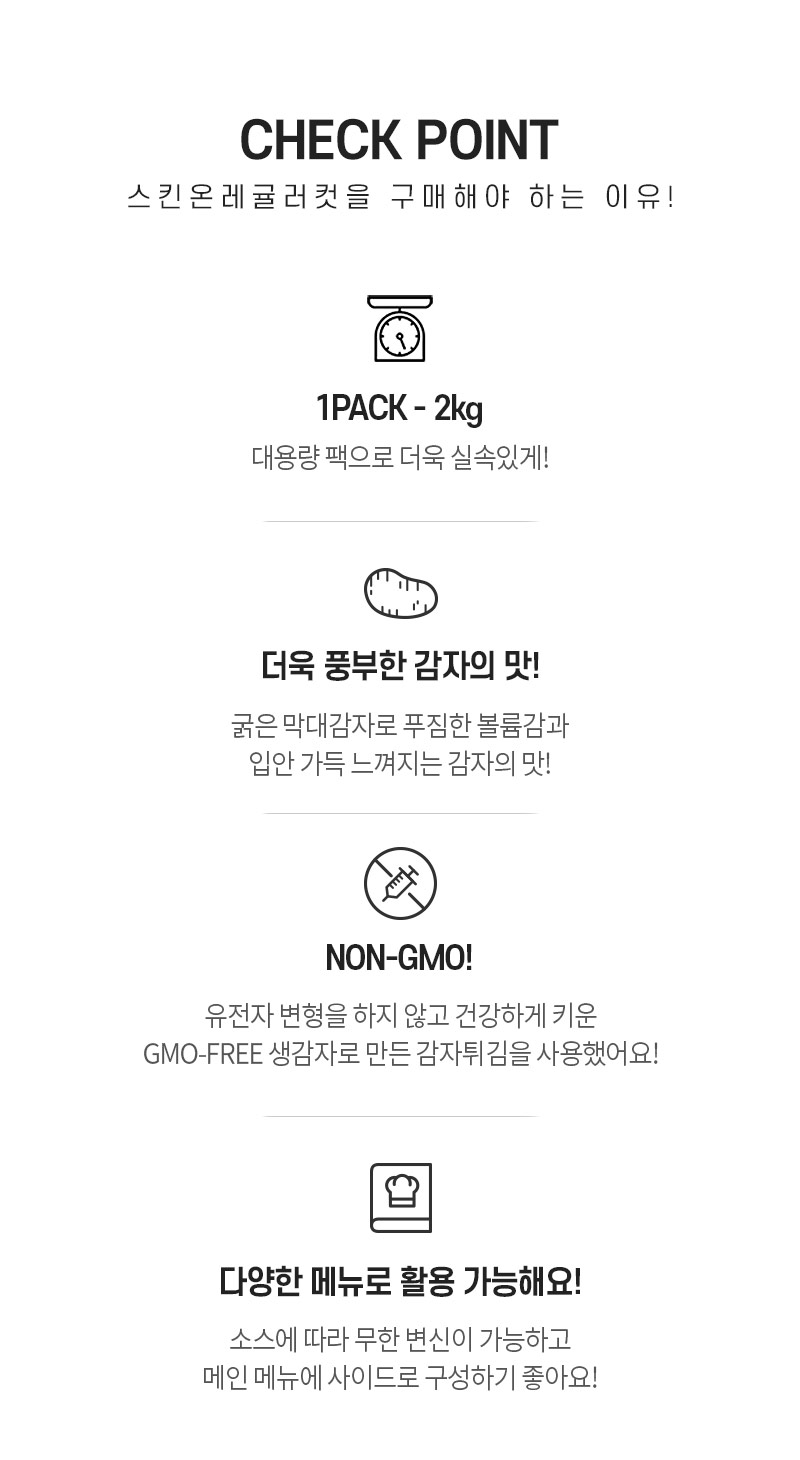 1. 조리 시 기름이 튈 수 있으니 주의하십시오. 2. 조리 후 제품이 뜨거우니 꺼내거나 드실 때 조심하십시오. 3. 본 제품은 감자를 가공한 것으로 일부 검은 점(BLACK SPOT)이 발견될 수 있으나 이는 1차 기름에 튀기는 과정에서 생성되는 감자 성분의 일부로 이물질이 아닙니다. 4. 이미 냉동된 바 있으니 해동 후 재냉동시키지 마시길 바랍니다. 부정·불량식품 신고는 국번 없이 1399 |