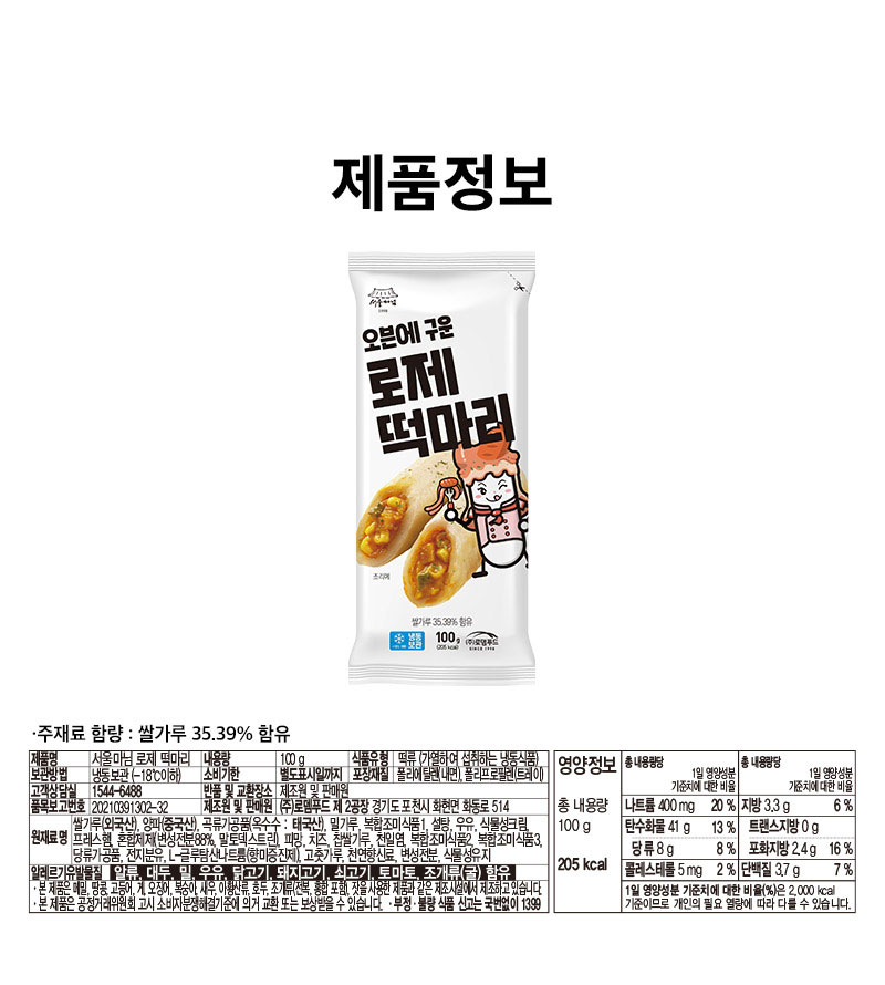 | 알레르기 유발물질 | 알류, 대두, 밀, 우유, 닭고기, 돼지고기, 쇠고기, 토마토, 조개류(굴) 함유 | ||