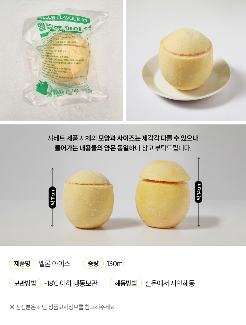 멜론 샤베트는 태국에서 제품의 중량에 맞게 기계로 구멍을 내서 파내어 셔벗을 넣어 얼린 후 국내로 수입되는 제품입니다.